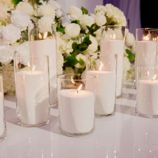 Guest tables are styled with a carefully balanced arrangement of glass vases filled with candle sand and flickering candlelight, offering an elegant glow that feels refined and timeless.
